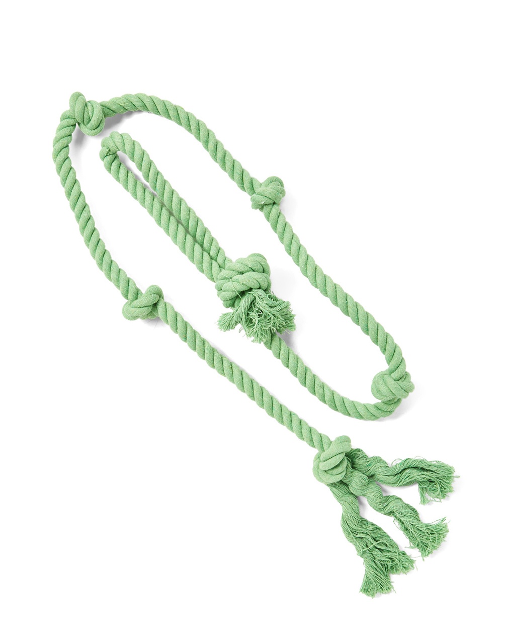The name says it all!  This tough rope toy is 5 feet long with a loop on one end and 5 knots running down the length for you and your dogs to be able to get a good firm grip. Excellent for playing tug-o-war with your dogs and is long enough to allow you to stand up straight while using it to help save your back! This is also the hanging rope toy used on our popular Solo Slinger zip line toy. It is available in pink or green.