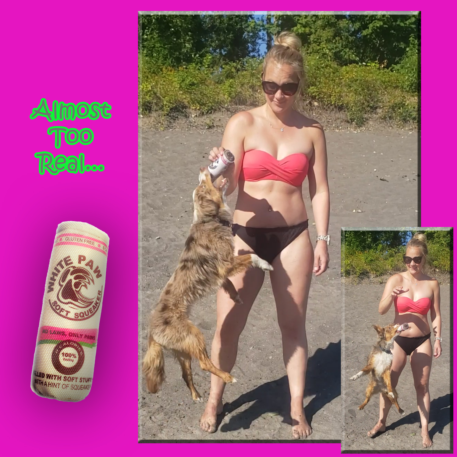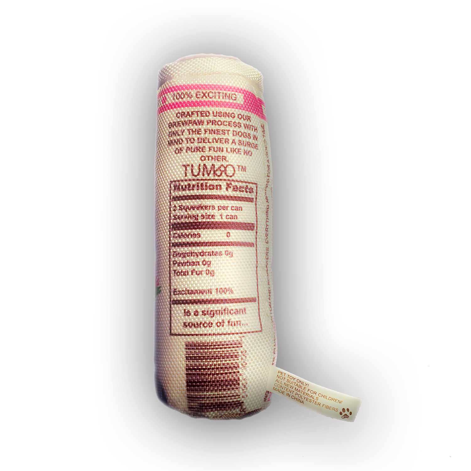 Please Note: This toy is funny and great for pictures and tossing around. However, your pup can chew through this delicate plush toy as fast as you can chug the real thing. So be careful and take it away when they are trying to chew it or play tug of war. We offer this in a set with a strong rope toy as well for when your dog wants to chew. Warning: Please play responsibly and never play with your dog while operating a motor vehicle… The Tumbo Tins all started with our very first White Paw Soft Squeaker dog toy.