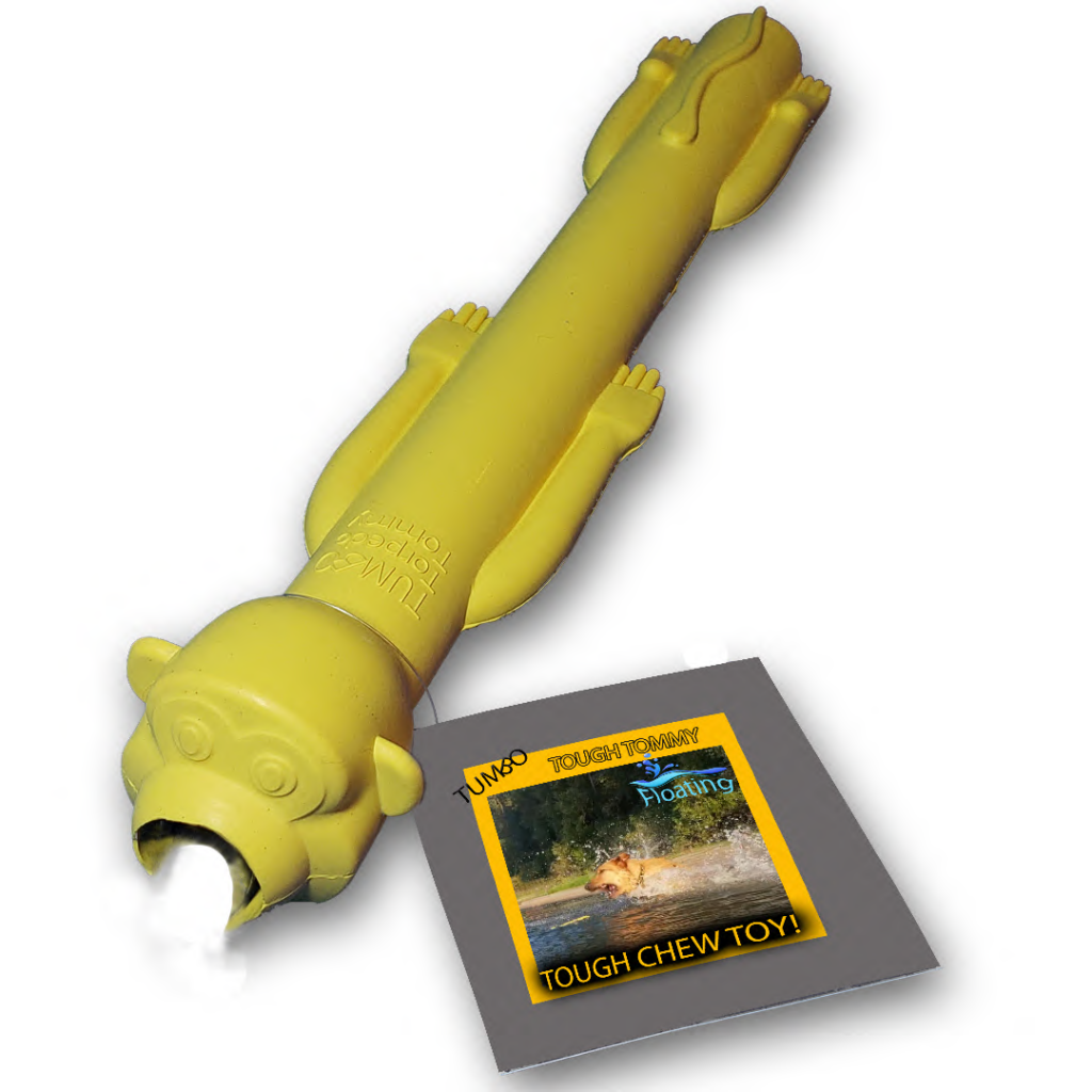 Tough Tommy is a heavy duty rubber dog toy that will withstand chewing very well. This yellow floating version is slightly lighter and softer, but withstands chewing all the same. Great for tossing around the yard or in the lake! * This does not have the launch bands inside like the Torpedo Tommy. Yellow Monkey-shaped…